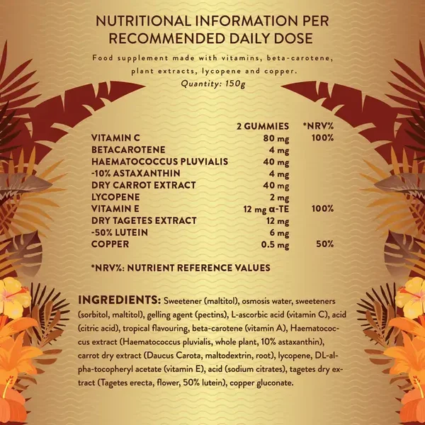 Sunny Beauty is een heerlijke veganistische gummy geformuleerd met bètacaroteen, wortel extract, astaxanthine, lycopeen en goudsbloem (tagetes) om een natuurlijk stralende, goudkleurige teint te ondersteunen. Ideaal als beauty metgezel tijdens zonnige maanden of het hele jaar door.